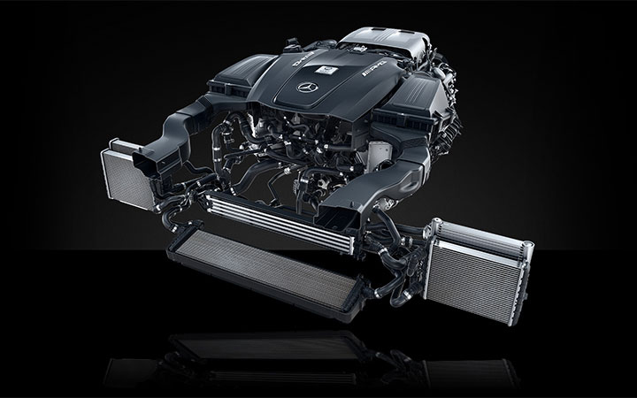 Performanta excelenta a unui autovehicul sport se bazeaza pe distributia optima a greutatii. Predestinat pentru performanta, datorita transmisiei cu diferential. Motorul amplasat central in fata este conectat prin intermediul unui arbore de transmisie extrem de usor si de rezistent la torsiune, fabricat din carbon, la transmisia cu dublu ambreiaj montata pe puntea spate. Propulsia este asigurata de un motor de inalta perfromanta, dezvoltat de noi. Integrat bine in caroseria Spaceframe din aluminiu, noul motor AMG V8 Biturbo de 4,0 l este prevazut cu un sistem de ungere sub presiune cu carter uscat. Acest lucru contribuie la coborarea centrului de greutate si asigura o alimentare optima cu ulei, chiar si in cazul unei accelerari laterale puternice. Pentru a imbunatati performanta noului motor V8, cele doua turbocompresoare sunt amplasate intre cilindrii dispusi in V in blocul motor. Acest lucru permite un flux optimizat de aer proaspat si asigura un flux perfect pentru turbocompresoarele antrenate de gazele de esapament. Rezultatul: timpi de reactie optimi ai motorului. Pentru cel mairidicat grad de durabilitate si pentru o functionare ireprosabila, alezajele cilindrilorsunt acoperite folosind tehnologia NANOSLIDE®, dezvoltata de Daimler. Transmisia sport cu 7 trepte de viteza AMG SPEEDSHIFT DCT transforma rapidputerea in acceleratie. Este precisa, incredibil de rapida si iti taie respiratia